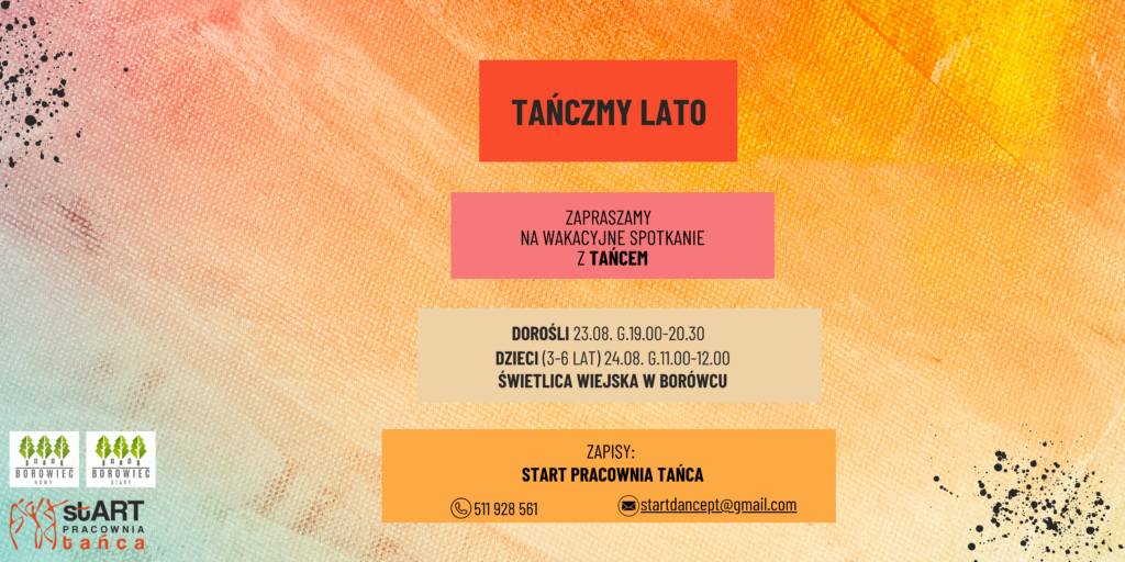 Łapiemy ostatnie chwile lata i powoli przygotowujemy się do spotkań z tańcem i muzyką. Spotkania rozpoczynamy od 16 września według poniższego planu: poniedziałek g. 17.00 Czmoń – Jezioro Małych Łabędzi wtorek g. 17.00 Czmoń – Pracownia Tańca wtorek g. 20.00 Czmoń Taniec dla Dorosłych środa g. 16.30 Borówiec – Jezioro Małych Łabędzi środa g. 19.00 …